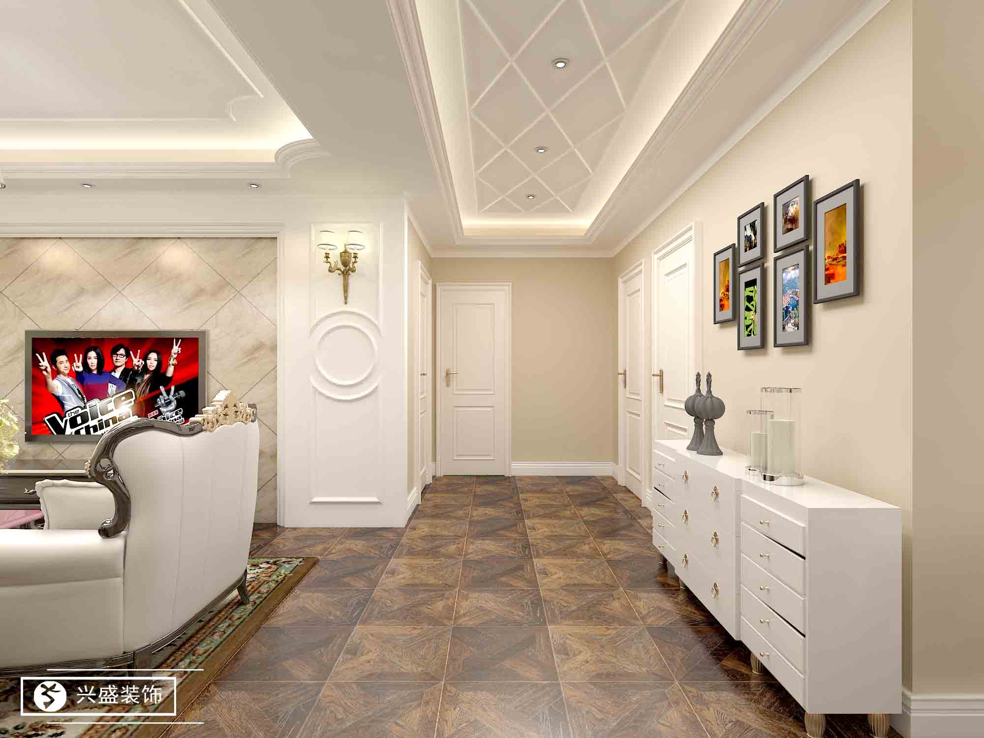 墻面的其它地方留咖,減少復(fù)雜的形式感,過道是菱形石膏線條搭配筒燈。