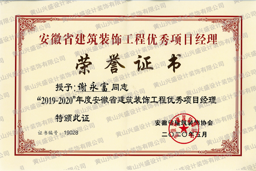 慶祝興盛裝飾榮獲“2019年度黃山市優(yōu)秀建筑業(yè)企業(yè)”獎,公司項目經(jīng)理謝永富、胡龍祥榮獲“2019年度黃山市建筑業(yè)企業(yè)優(yōu)秀項目經(jīng)理”獎。